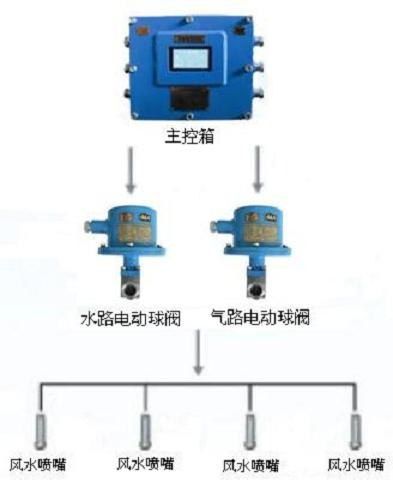 當傳感器探測到控制信號時,信號送入主控箱,主控箱先后控制高壓風閥、高壓水閥開啟,將高壓風、高壓水輸送到風水噴頭(即氣水噴頭)進行噴霧降塵(風水噴頭可對風水壓力大小進行調(diào)整),噴霧工作至延時時間(延時可調(diào))停止噴霧降塵;當信號再次觸發(fā)時,進行下一個工作循環(huán)過程。